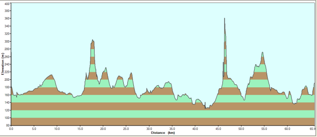 kb. 70 km, kisforgalmú közutakon, kissé dimbes-dombos tájon.