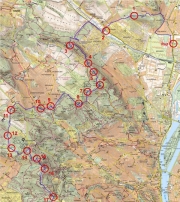 Rómaifürdő HÉV állomás - Péter-hegy - Ürömi vasútállomás - Csúcs-hegy - Virágos-nyereg - Vihar–hegy - Hármashatár-hegy - Újlaki-hegy - Határ-nyereg - Homok-hegy - Hűvösvölgy - Fazekas-hegy - Adyliget - Petneházy-rét - Vadasparki parkoló - János-hegy - Normafa