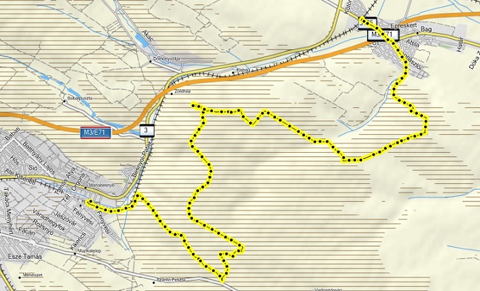 Ott megálltunk, ettünk, beszélgettünk. Azután a túraleírást követve, nem a közvetlenül Bagra vezető úton mentünk tovább, hanem balra, mintha Domonyvölgy felé mennénk. De nem kellett még a főutakig sem menni, előbb elkanyarodott az út Bag felé. Az egyik kanyarnál tettünk egy kis kitérőt, kilátóhelyet írt a könyv. Nagy kilátás nem volt, de onnan is lehetett látni a tájat, a templomot. A leírás egyébként nagyon pontos volt, nemrég készülhetett, minden forduló, kerítés szerepelt benne. A kerítéseken sajnos át is kellett mászni, összesen hat létrázást számoltunk. Az egyik résznél Ágota felolvasta, hogy még egy-két kanyar, kerítés onnan már csak 6 km Bag. Nem voltunk nagyon fáradtak, de akkor már éreztük a lábunkkal is, hogy ha így van, akkor több lesz a megtett út, mint a könyben leírt, tervezett, összesen 13 km. Megnéztük, mit mutat a GPS - két független mérés szerint is túl voltunk már a 13 km-en. De senki nem panaszkodott, a kellő erőnlét mindenkinél megvolt. Így hát mentünk tovább, követve a turistajelzéseket.